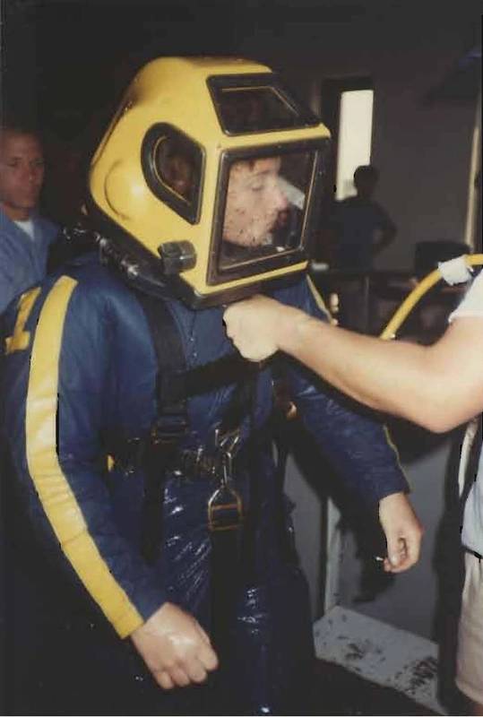 Fähnrich Deb Bodenstedt im Taucherhelm Mk 12 und in voller Tauchermontur während der Ausbildung zum Basic Diving Officer im Naval Diving and Salvage Training Center in Panama City, Florida, im Jahr 1983. Foto mit freundlicher Genehmigung von Deb Bodenstedt.