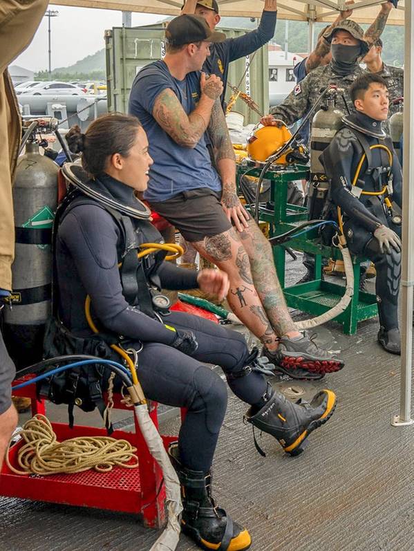 Cheftaucherin der Marine Melissa Nguyen-Alarcon, zugeteilt der Mobilen Tauch- und Bergungseinheit Eins, bereitet sich auf den Tauchgang in der KM 37 NS während einer gemeinsamen Tauch- und Bergungsübung mit den Tauchern der Republik Korea auf dem Marinestützpunkt Chinhae am 30. Mai 2023 vor. Marinefoto von Mass Communication Specialist 2. Klasse Heath Zeigler/Veröffentlicht.