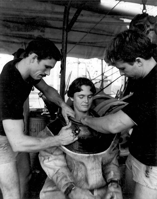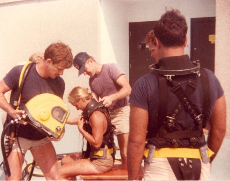 Lieutenant Karin Lynn bereitet sich darauf vor, den Taucherhelm Mk 12 im Schwimmermodus mit Gurtzeug während der Ausbildung zum Basic Diving Officer im Naval Diving and Salvage Training Center in Panama City, Florida, im Jahr 1983 aufzusetzen. Foto mit freundlicher Genehmigung von Karin Lynn.