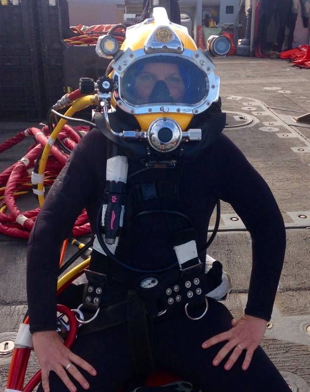 Navy Diver Chief Petty Officer (im Ruhestand) Becky Jones bereitete sich auf einen Tauchgang mit dem Mk 21-Helm und Neoprenanzug vor. Foto mit freundlicher Genehmigung von Chief Becky Jones.